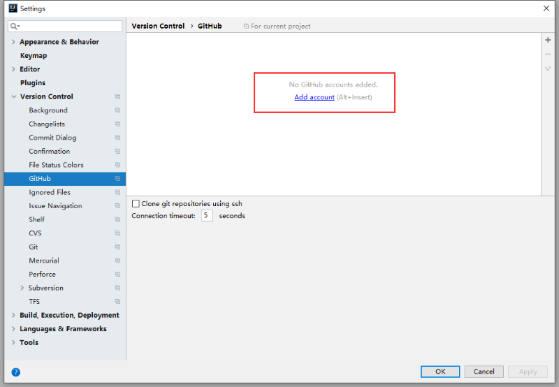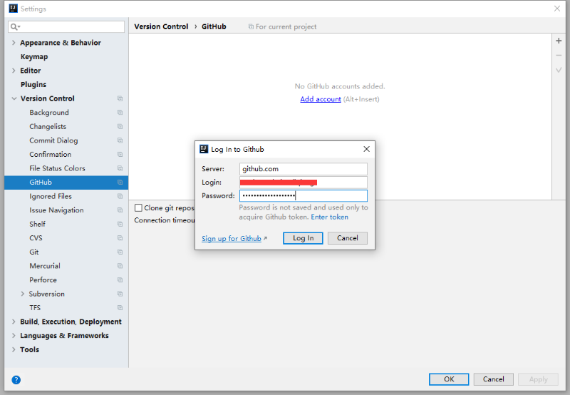 # 在File-->Setting->Version Control-->GibHub中登录GitHub;Server:github.com;Login和PassWord为刚刚第一步中注册的用户名和密码,登录成功后会收到github.com发来的邮件