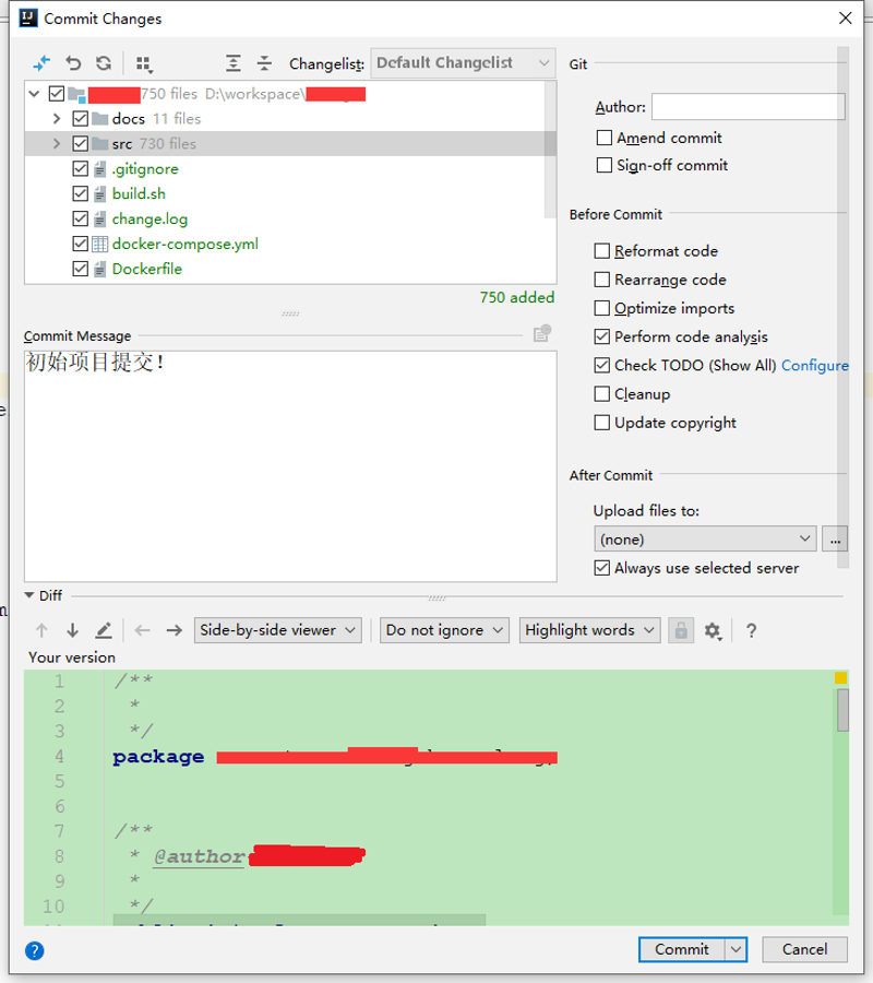 修改文件:右键项目Git-->Commit Directory,此时会显示有变动的文件,可查看具体变动的地方,并输入描述后,点击Commit and Push即可提交